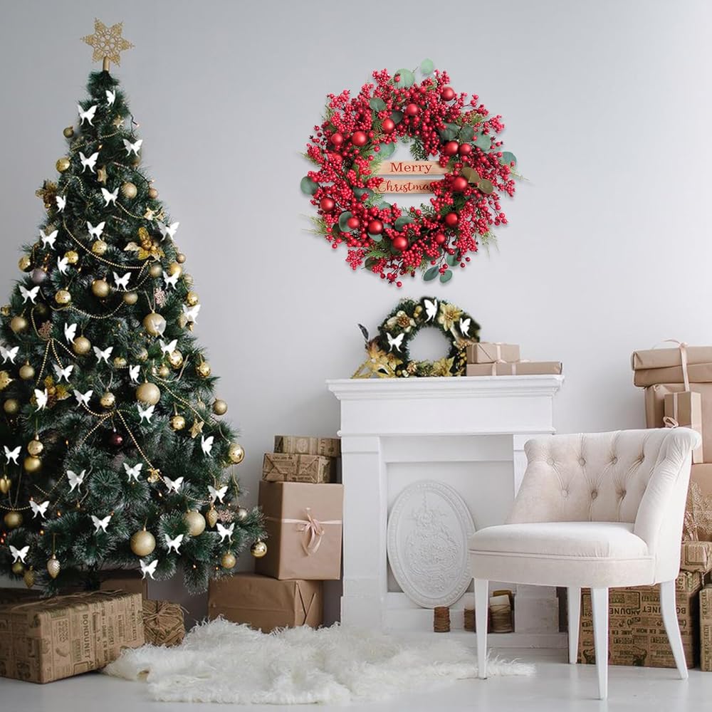 24 inch Christmas Wreaths with Berry and Eucalyptus Leaves, Red Christmas Front Door Wreath with Pine Branch,Ball Ornaments Artificial Wreath for Indoor and Outdoor Decor