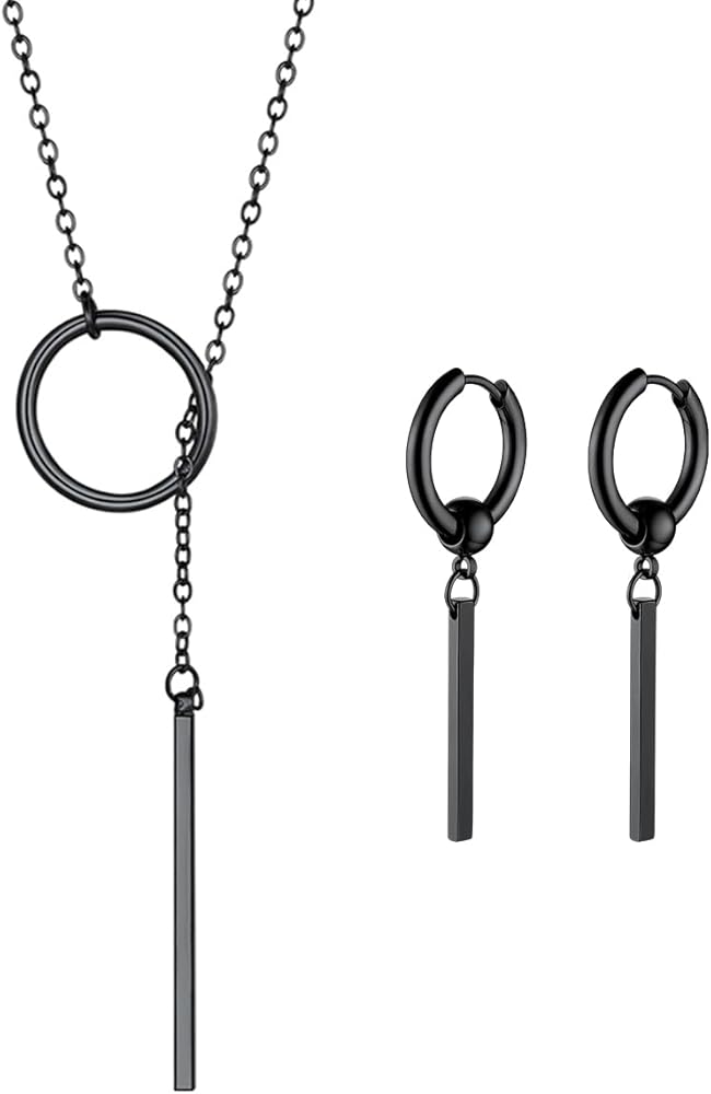 Size: black long necklace length 73cm/28.7". Drop Bar Size: 4cm/1.57"; Thickness: 2mm. Weight: 6g. Black Dangle Earrings for Women Men: Approximately 47mm X 2mm (L*W).