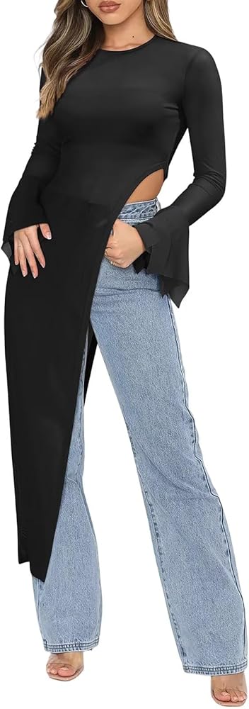 BWQ Womens Long Bell Sleeve Mesh Sheer High Low Asymmetrical Sexy Tunics Blouse Shirt Top Dress with Tube Top