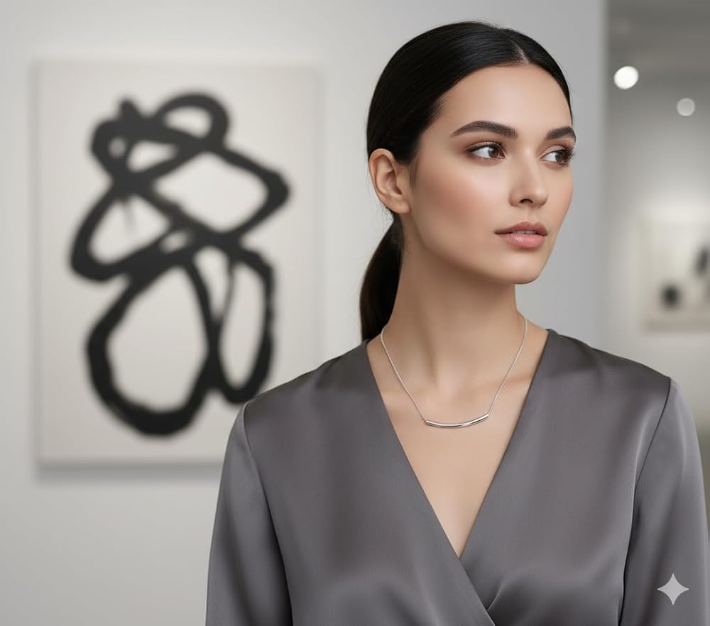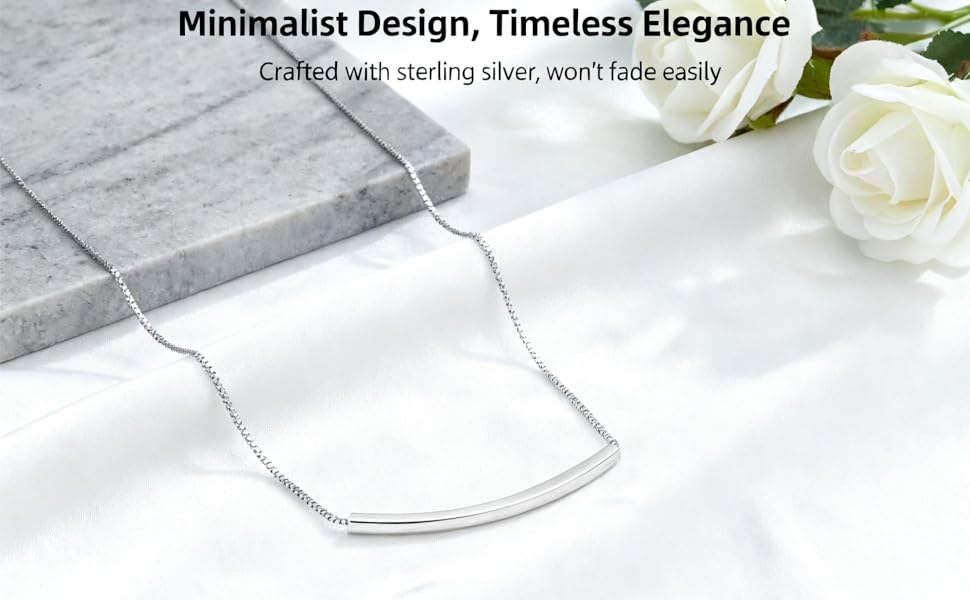 Minimalist Versatile Design The simple silver bar necklace boasts a sleek geometric silhouette; Its minimalist elegance pairs well with any outfit from casual to formal; An ideal balance bar necklace sterling silver for layering or wearing solo