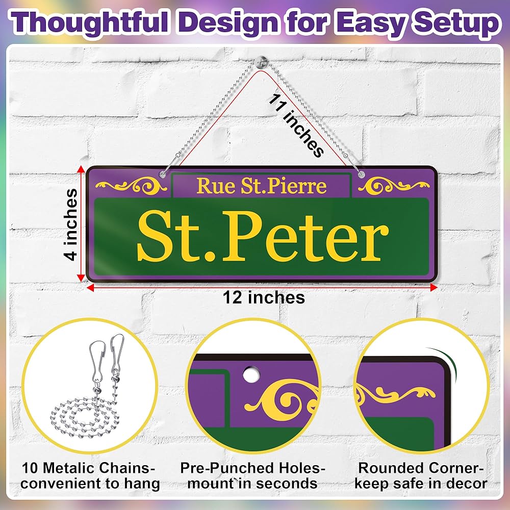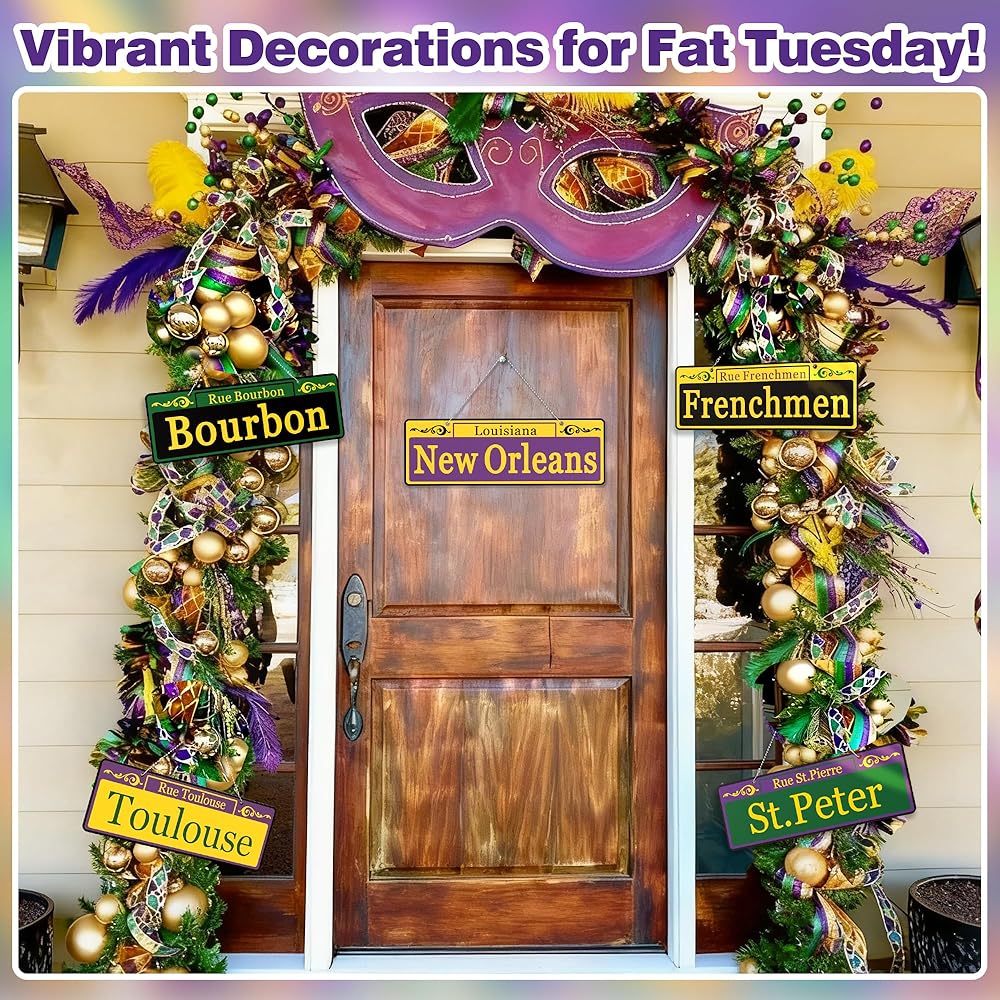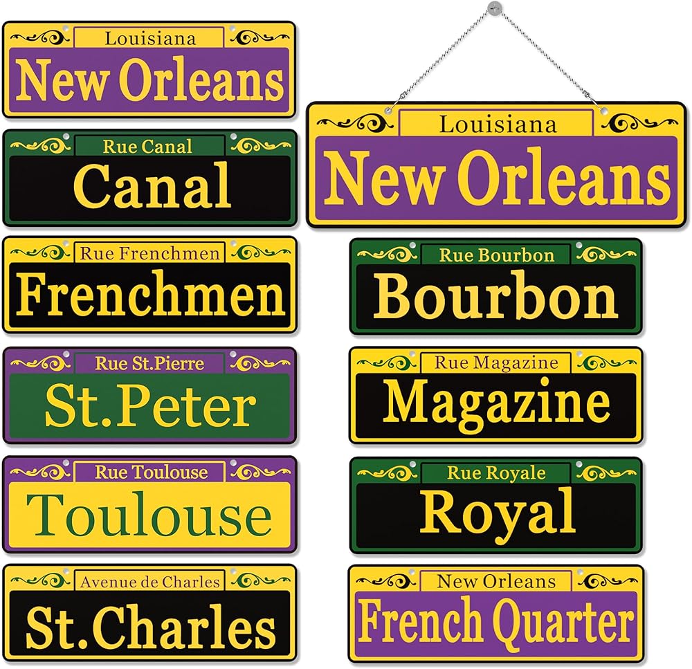 Iconic Street Signs 10-Set: Celebrate Mardi Gras 2026 with these New Orleans signs featuring iconic street names like Bourbon, Royal, Canal and St. Peter; each comes with a hanging chain, ready to decorate Mardi Gras trees, carnival parties, halls or porches