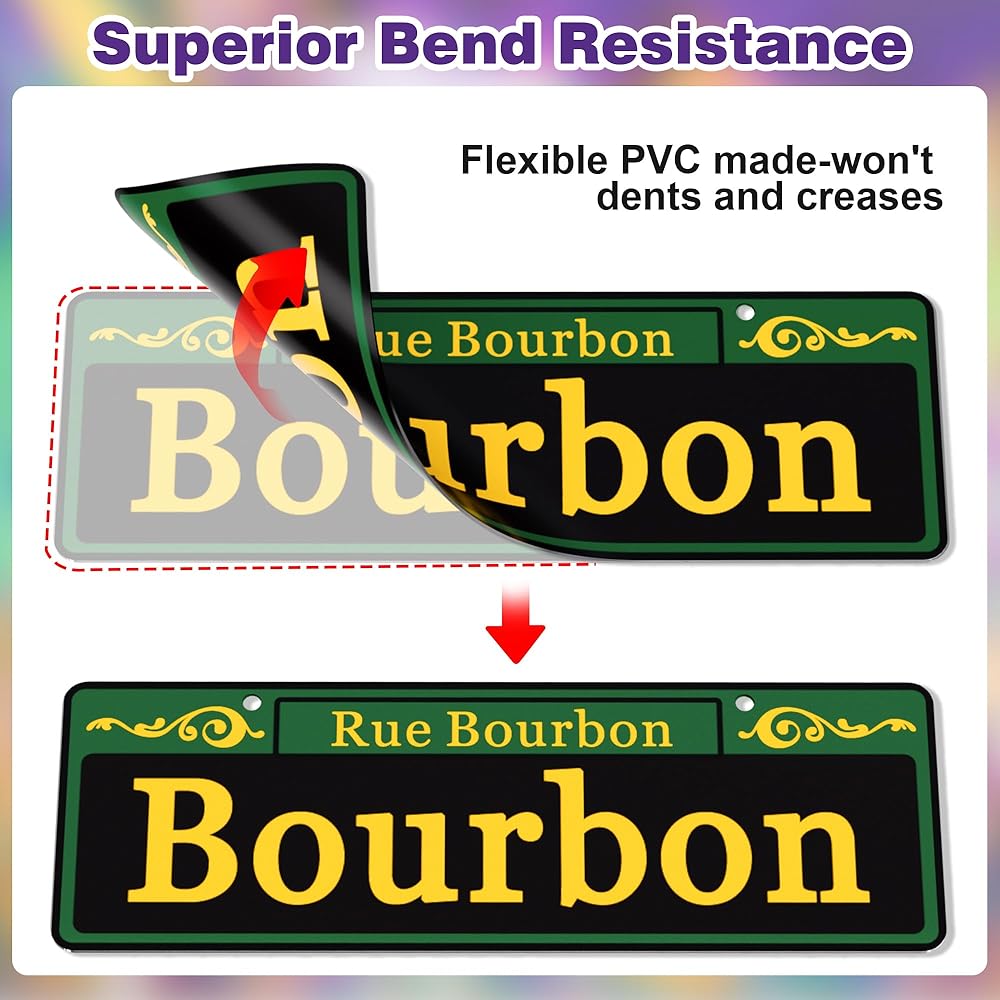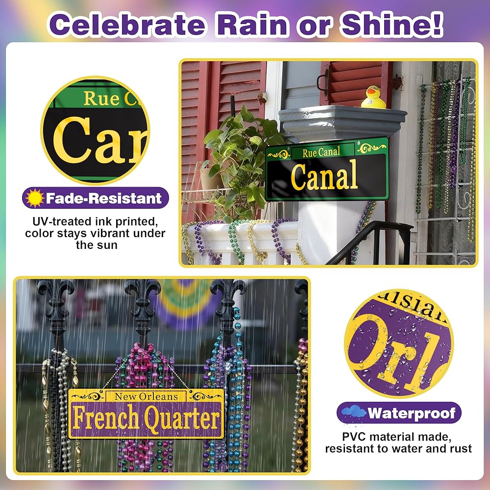 Authentic NOLA Look & Vibe: Each New Orleans decor measures 12 x 4 in - the same size as real New Orleans street sign with the purple, green, and yellow palette of carnival; crafted from high-density PVC that resists bending and rust for long-lasting fun