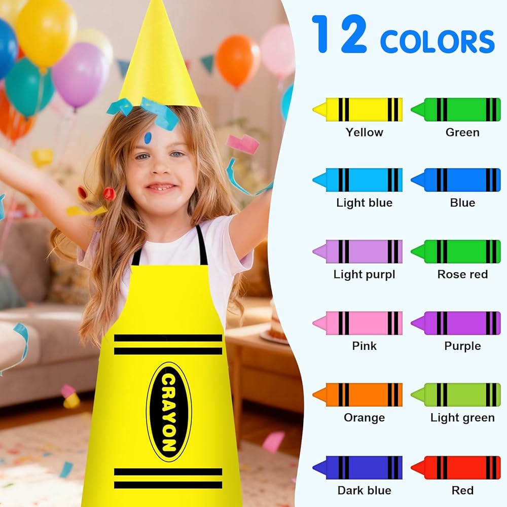 Complete 24 Piece Set: 12 crayon hats and 12 crayon aprons in 12 vibrant colors for easy distribution at group costumes for adults and coordinated large group costumes for adults.