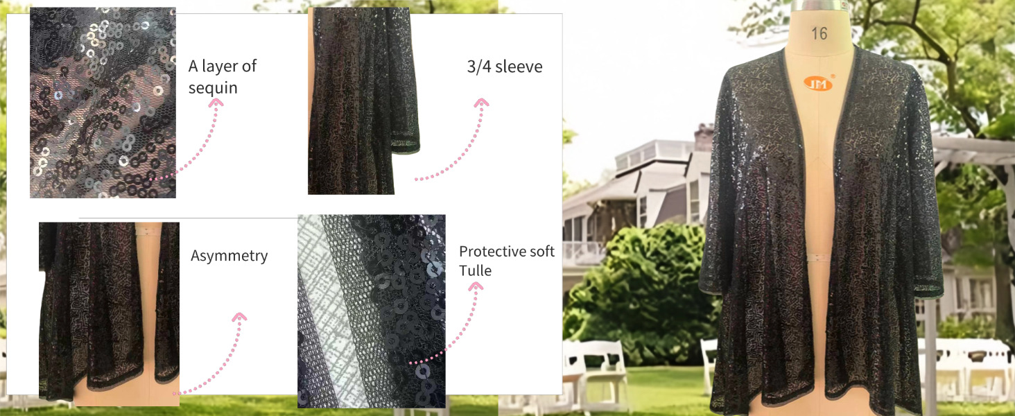 Premium Material: Crafted from 100% polyester with exquisite sequin lace, this jacket not only provides comfort but also ensures durability. The high-quality fabric is gentle against the skin and won't irritate during wear.