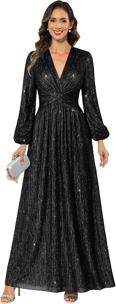 Features: Long sleeve mother of the bride dresses for women, ruffle sequin mother of the groom dress, sequin maxi formal dress for women, glitter/sparkly, empire waist, corset, v neck, a line, zipper. simple design let your looks elegant and charming