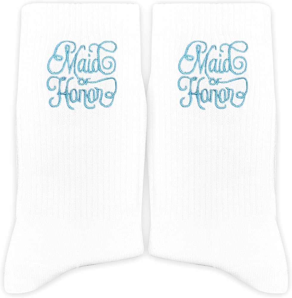 Elegant Blue Embroidery – Stylish maid of honor lettering in blue makes these socks stand out.