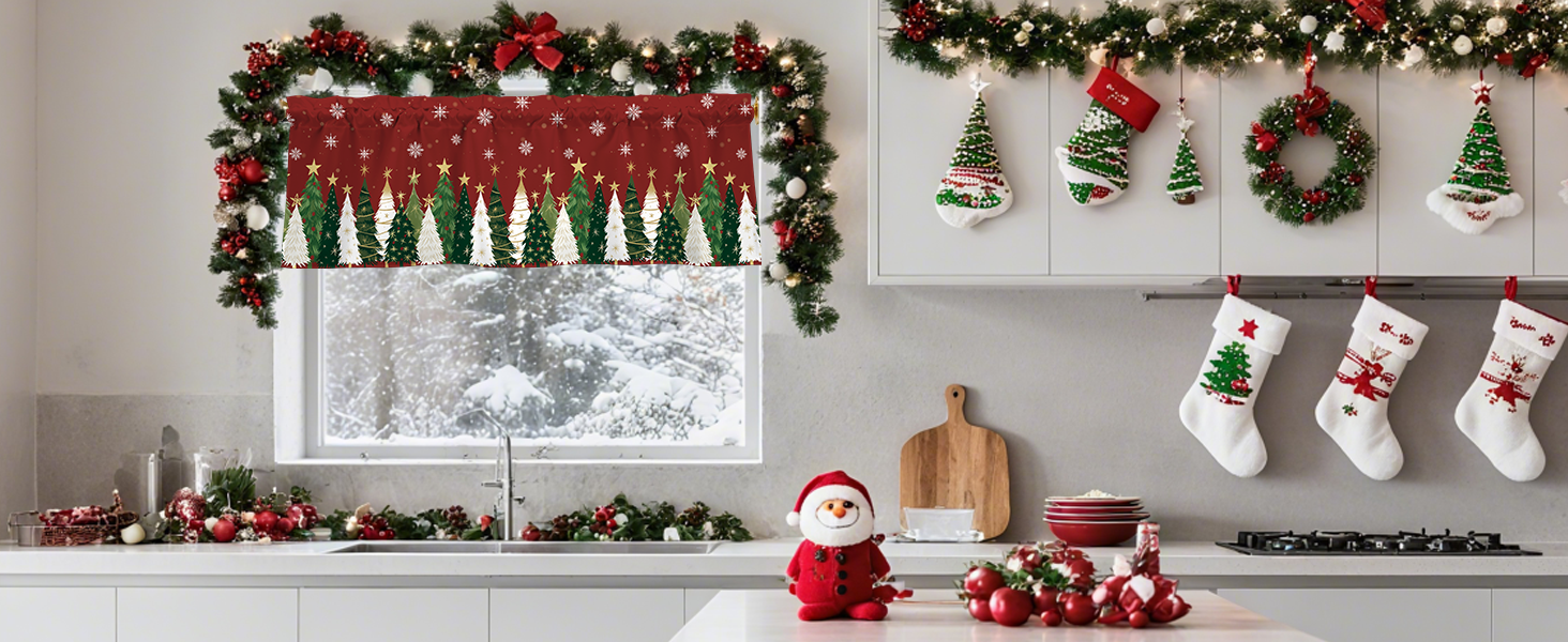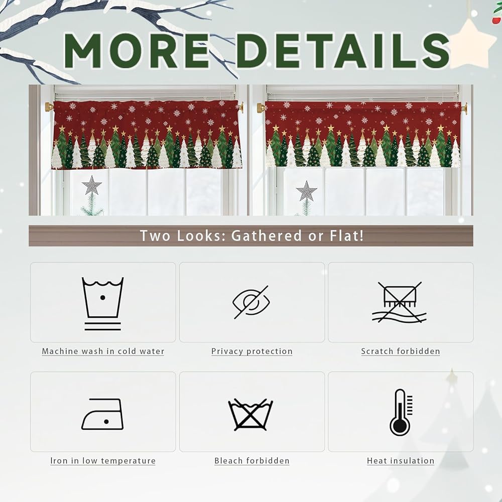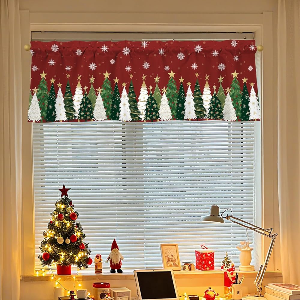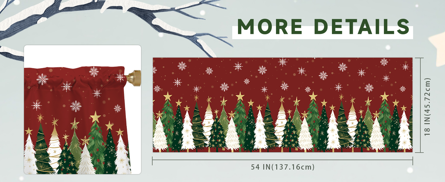 【Theme Design】The Christmas Curtain Valance features a deep red background with snowflakes, golden stars, and rows of green and white Christmas trees, creating a rich and joyful Christmas atmosphere.