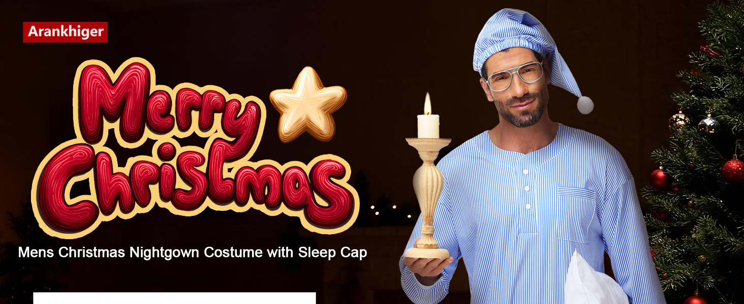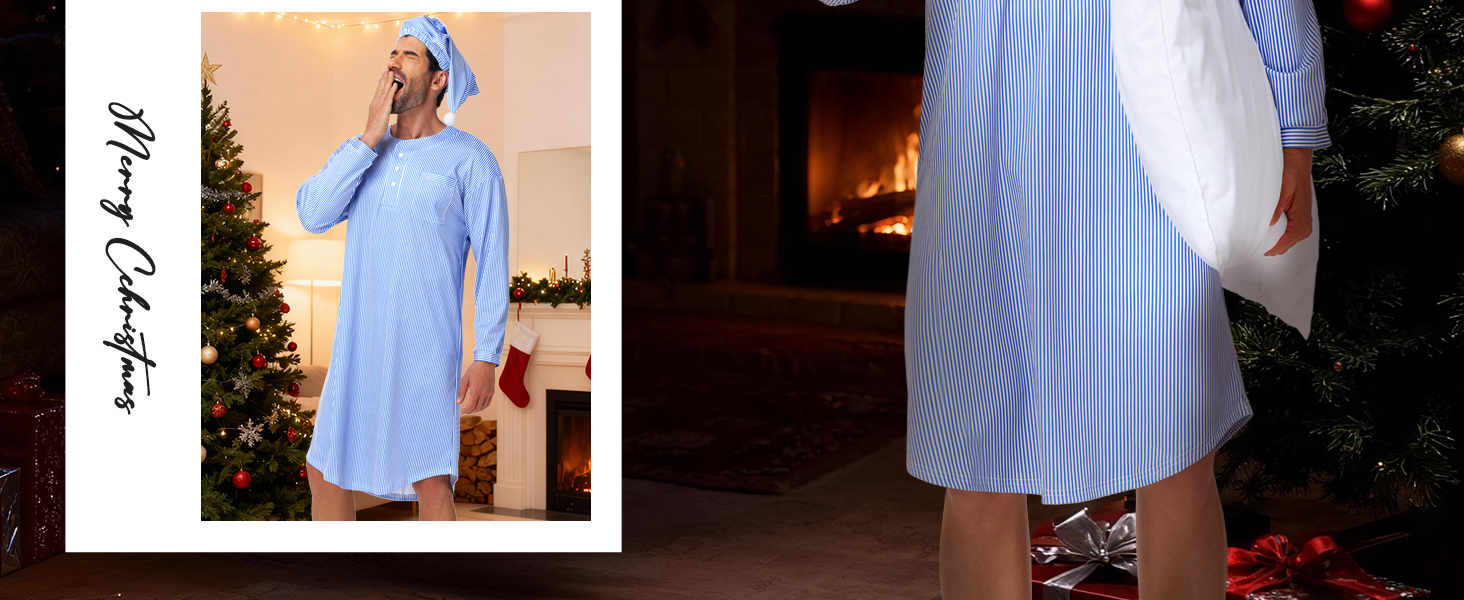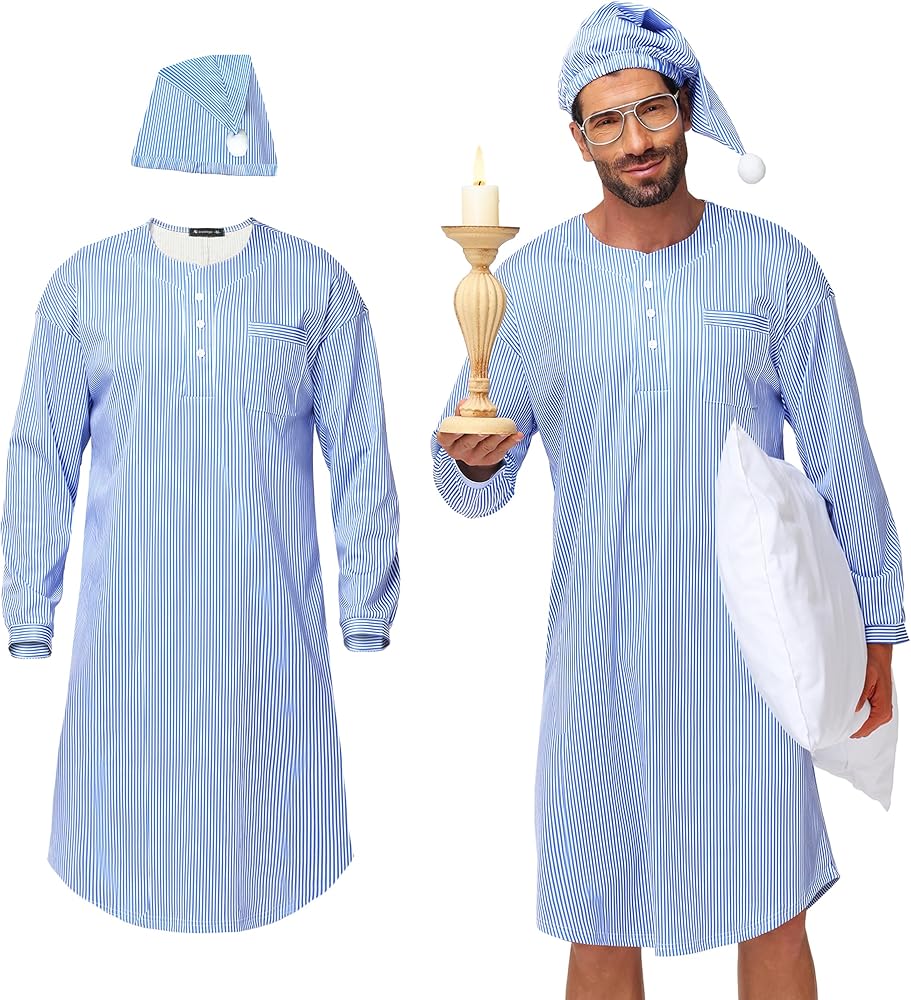 Xmas Cosplay Nightgown: Featuring a classic blue and white vintage stripe pattern, long sleeve, button design, and a front pocket, plus an included sleep cap with elastic band and a playful white pom-pom for that iconic miser look