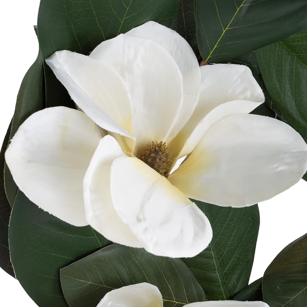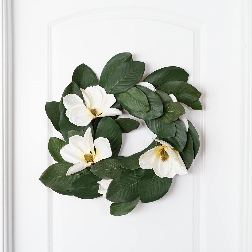 FLOWER WREATH SET OF 2 - This door wreath set is made of artificial bright white magnolia flowers, accented with magnolia leaves that cover the base. These wreaths are a beautiful way to bring springtime into your farmhouse décor.