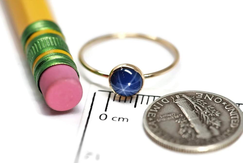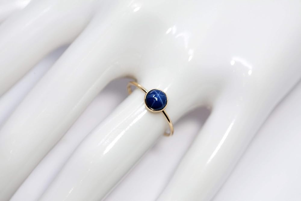This handmade ring features a 6mm Lab Created Star Sapphire, bezel mounted on a skinny 1mm wide 14K Gold Filled Plain band. Polishing cloth and reuseable ring sizer included.