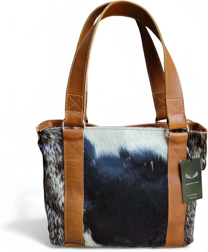 Handcrafted, Functional and Stunning. This eye catching handbag is meant for everyday functionality. The beautiful cowhide plus our top grain antique Buffalo saddle leather stands out in a crowd and is sure to be a show stopper. This handbag is just the right size to become your everyday bag that can be used for just about any of your needs. From day to night this bag is perfect! Please note as cowhide is a natural material each bag is one of a kind and the pattern will differ on each handbag. Comes with a Ranch Junkie gift box. Dimensions: 10"Tall x 12"Wide X 5" Exterior- -Made from 100% Top Grain Vintage Buffalo Saddle Leather and 100% Cowhide Leather (Cowhide is on Front of Bag) -Built Tough With Antique Buffalo Saddle Leather Straps And Bottom And Back -Strap Drop 10" -Premium Hardware and Zippers -Zipper Closure On Top -Our Bags Are Made From All Natural Leather. For This Reason, Textures And Color Can Vary Slightly And Will Become More Vintage Looking With Every Use. Natural markings of cowhide and color will vary from piece to peice Interior- -One Large 8"W X 6"D Zippered Pocket -Two Open Pockets - 5"W X 5"D -Heavy Duty Cotton Ranch Junkie Liner Please note: As it is handmade of a natural material, each bag varies slightly in texture and color. If you need to spot clean, first wipe with a humid soft cloth in the direction of the hair. Then use a sponge dampened with water or neutral soap to wipe away any dirt. 4. For stain removal, immediately remove any excess liquids or solids with a paper towel, soft cloth or sponge. Here are some more facts about the Buffalo Leather used in our bags: With appropriate care, buffalo leather will last a lifetime, developing, over time, a rich patina which enhances the beauty of the leather. To remove surface dirt and grease, wipe your Buffalo leather article with a damp cloth or use a commercial leather cleaner.