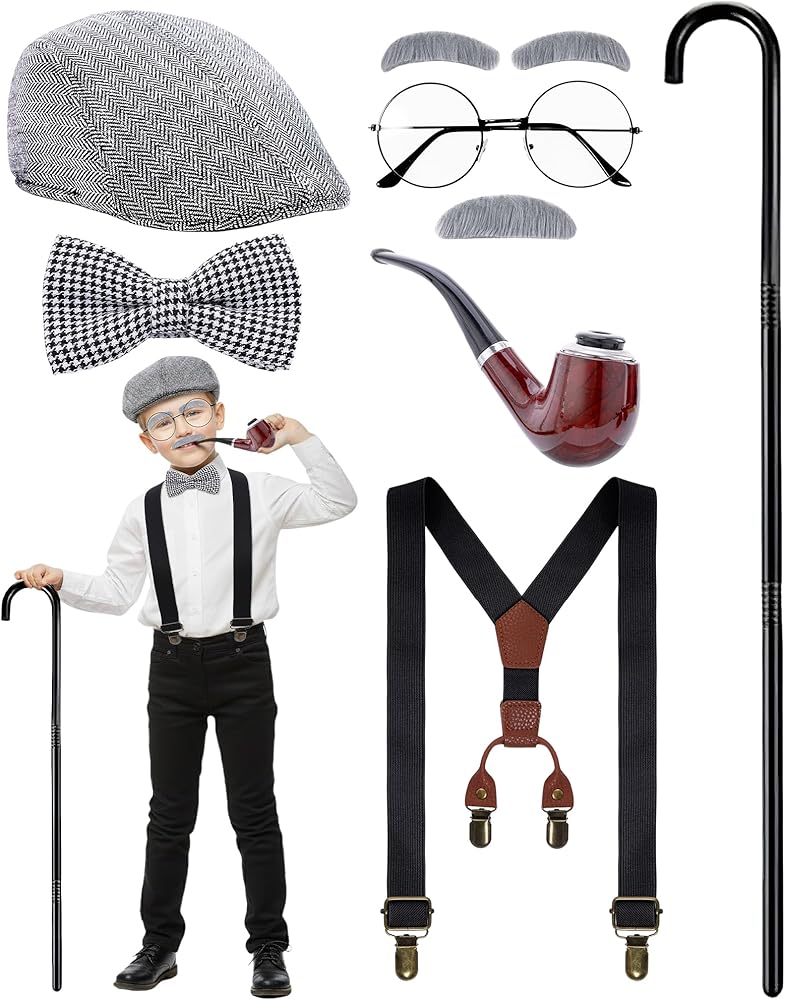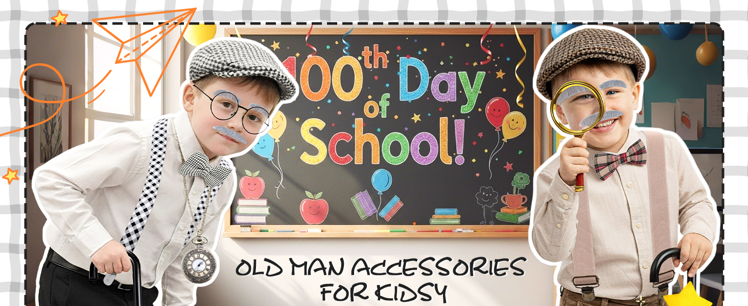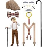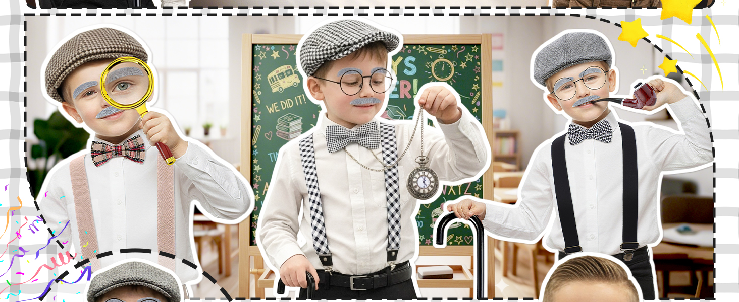 Complete Set: This 8-piece grandpa costume kit includes a hat, bow tie, suspenders, fake eyebrows, mustache, glasses, magnifying glass and a walking stick—everything need for a fun “100 Days of School” old man dress-up look