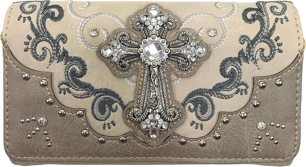 Silver rhinestone cross with western floral embroidered elements accompanied with rhinestones and turquoise studs. Blend of rich vibrant colors. Beautiful trifold versatile wallet. Wallet comes with attachable wrist handle and crossbody shoulder strap for better convenience. Great for traveling and vacations in the summer. Suited for any occasion to show off your glamorous and bling wallet. Carry your necessities in this compact appealing form factor anywhere like in the airport or waiting for a bus. Fast priority shipping and handling.