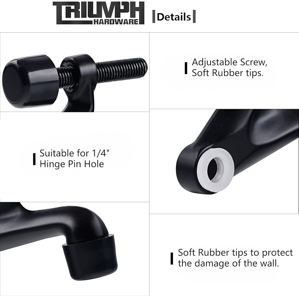 NO more dents & holes on the wall. Dress Up Your Home With Triumph Hardware. Your Home, Your Choice! Are you already tired of the sudden slamming of doors, worried that the knob might knock a hole in the wall You don't have to worry about that after you choose Triumph Hardware hinge pin door stop. Triumph Hardware door stop is easy to install. They can be adjusted to accommodate desired stopping position, turn the threaded screw attached to the stop, find the appropriate angle to keep your door away from your wall. Keep your door and wall safe and beautiful.