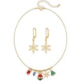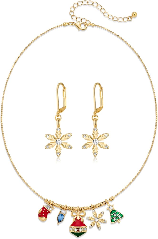 Elegant Christmas-Themed Design :This festive jewelry set features delicate snowflake earrings and a charm necklace with Christmas tree and sock pendants, perfect for adding holiday cheer to any outfit. The gold snowflake earrings and Christmas necklace create a coordinated look for seasonal celebrations.
