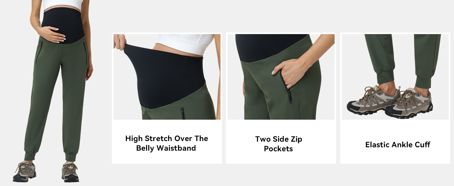 MATERIAL: Maternity joggers with High-Srtetchy, Breathability, Moisture Wicking and Comfortable Feel. Super lightweight, quick drying fabric can keep you dry and cool all day long.