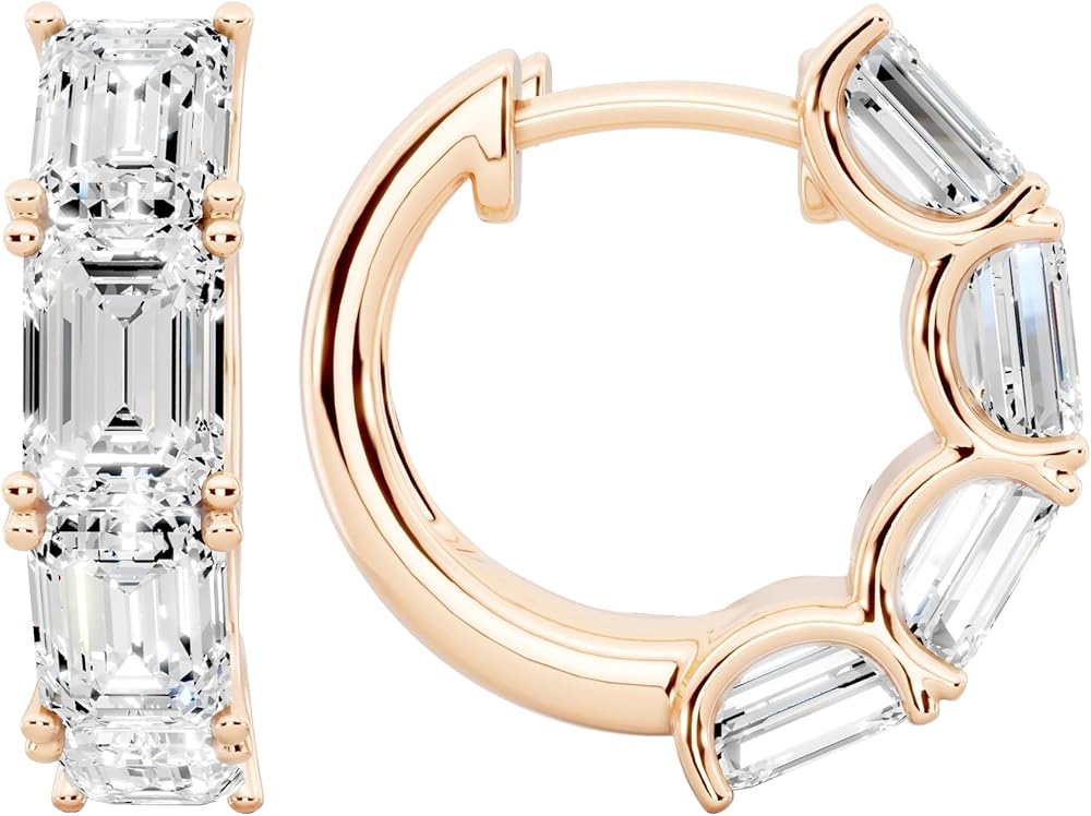 Moissanite Huggie Hoop Earrings: These 3.6 CTTW Emerald Cut Moissanite Huggie Hoop Earrings combine bold brilliance with everyday elegance. Measuring 3mm in hoop size, they are crafted in 14K gold plated 925 sterling silver and feature dazzling emerald-cut moissanite stones that radiate refined sparkle. Designed with a secure hinged closure, they offer a comfortable fit and effortlessly elevate both casual and formal looks. Expertly crafted from high-quality 925 sterling silver and finished with luxurious 14K gold plating, these moissanite huggies deliver lasting shine and elegance. Thoughtfully designed to be nickel-free and hypoallergenic, they're perfect for sensitive ears and comfortable enough for all-day wear, blending timeless style with everyday practicality. Featuring moissanite gemstones with a total carat weight of 3.6 carats, round-cut stones, color D, and clarity VVS1, moissanite is known for its exceptional brilliance and fire—shining even brighter than diamonds. Its intense sparkle and durability make it a stunning, ethical alternative to traditional diamonds. Celebrate life's special moments with this exquisite jewelry, suited for every occasion—Valentine's Day, anniversaries, birthdays, weddings, engagements, Mother's Day, Christmas, and more. Featuring the stunning April birthstone, this piece makes a thoughtful gift for women of all ages. At Bling Craft, every jewelry piece undergoes a thorough inspection before packaging to ensure the highest quality standards. Each item is beautifully packaged in a stylish gift box, making it an ideal choice for a special and unforgettable gift.