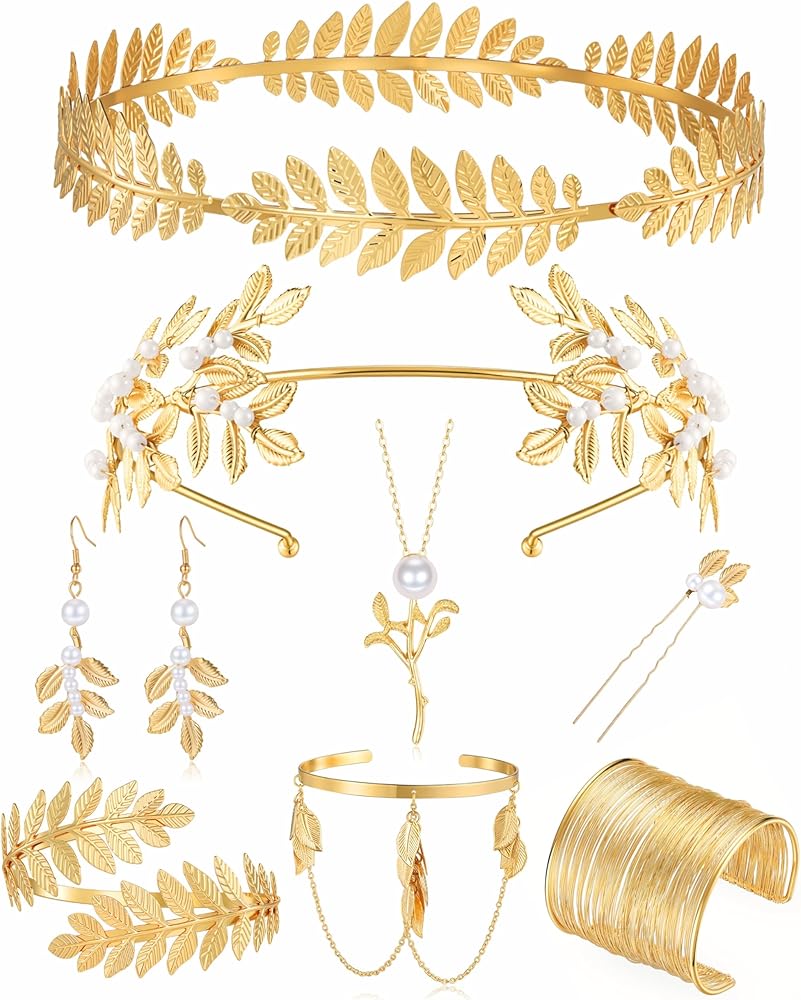 Comprehensive Set for Different Styling Needs: The package contains 10 items, a Greek goddess crown, a leaf headband, two leaf earrings, two adjustable leaf armbands (also bracelets), a golden coil bracelet, two leaf rings and a leaf hair comb. Maffuno rich beautiful Greek/Toga costume set can meet different needs for one or two person