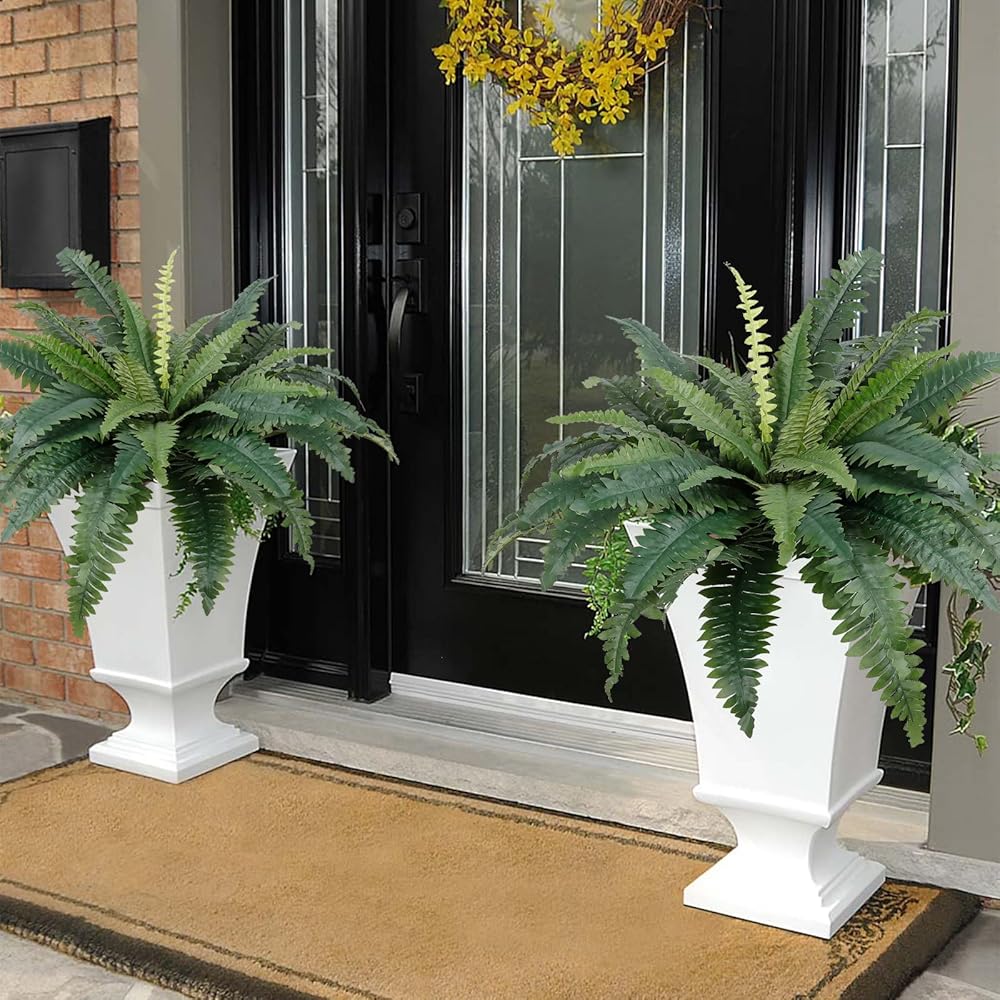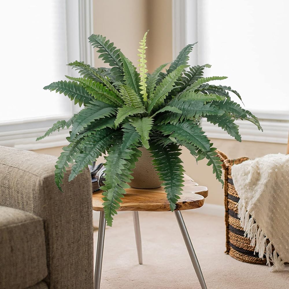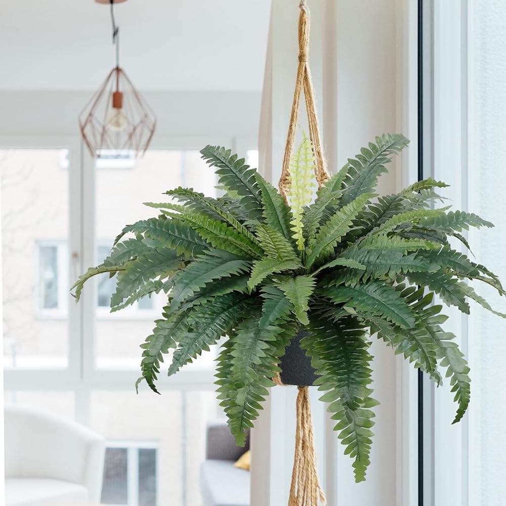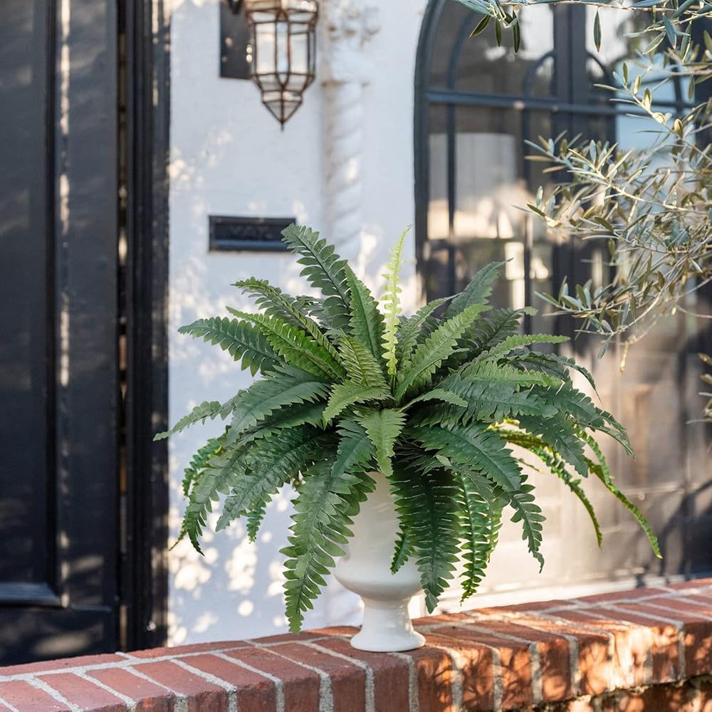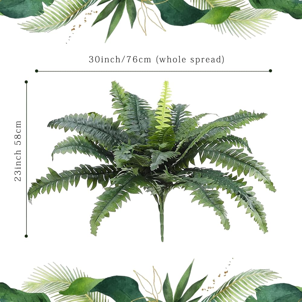 【UV Resistant Material】High quality artificial boston ferns with silk leaves and firm plastic stems. Large faux ferns are durable, natural color and hassle free, which can be washed by water and UV resistant. Seeing these beautiful, plump and fresh plants every day without worrying about sunshine, watering, pruning or other maintenance is simply a comfortable way of life.