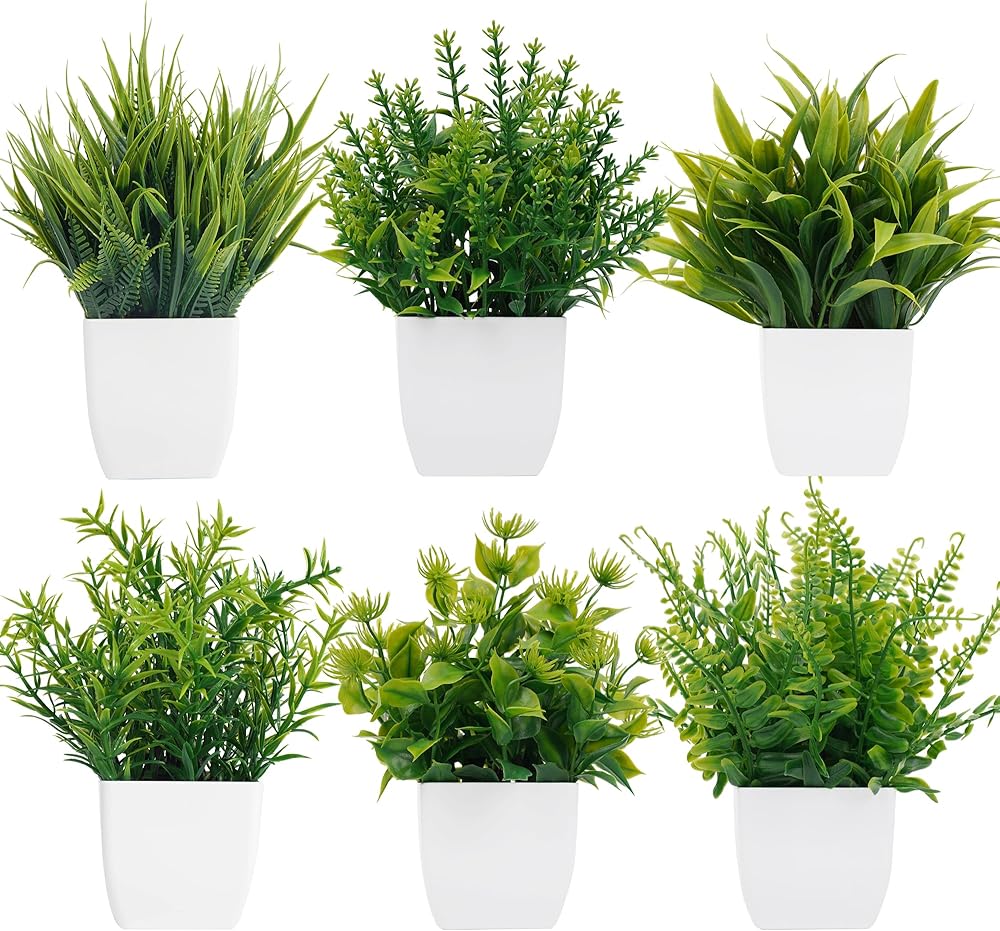 6 Pack Small Fake Plants Artificial Potted Plants Faux Greenery Plants with Pot for Home Office Table Shelf Bathroom Farmhouse Indoor Decor - White Pot