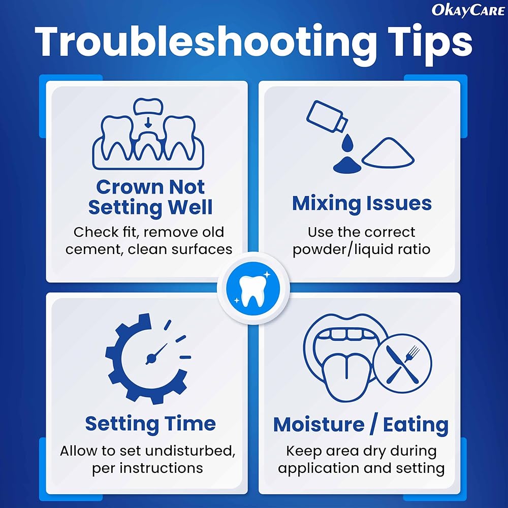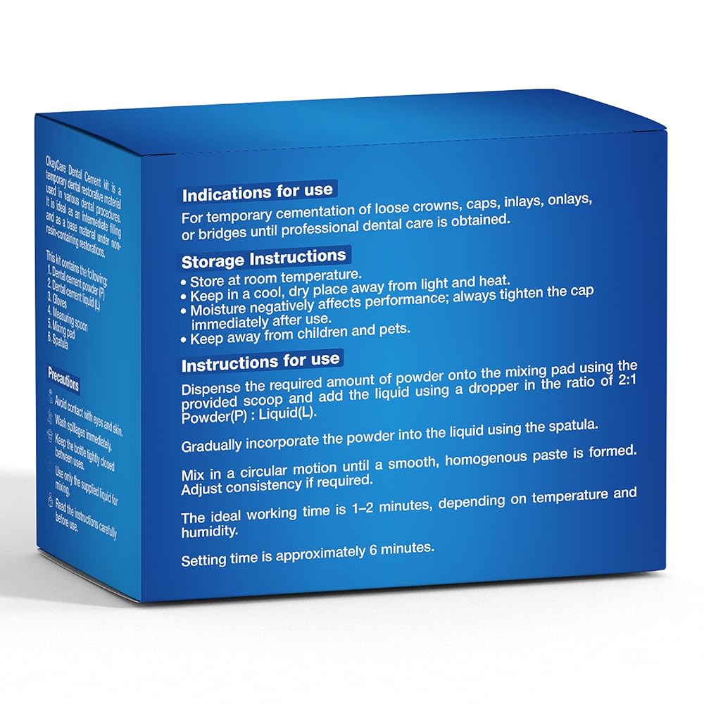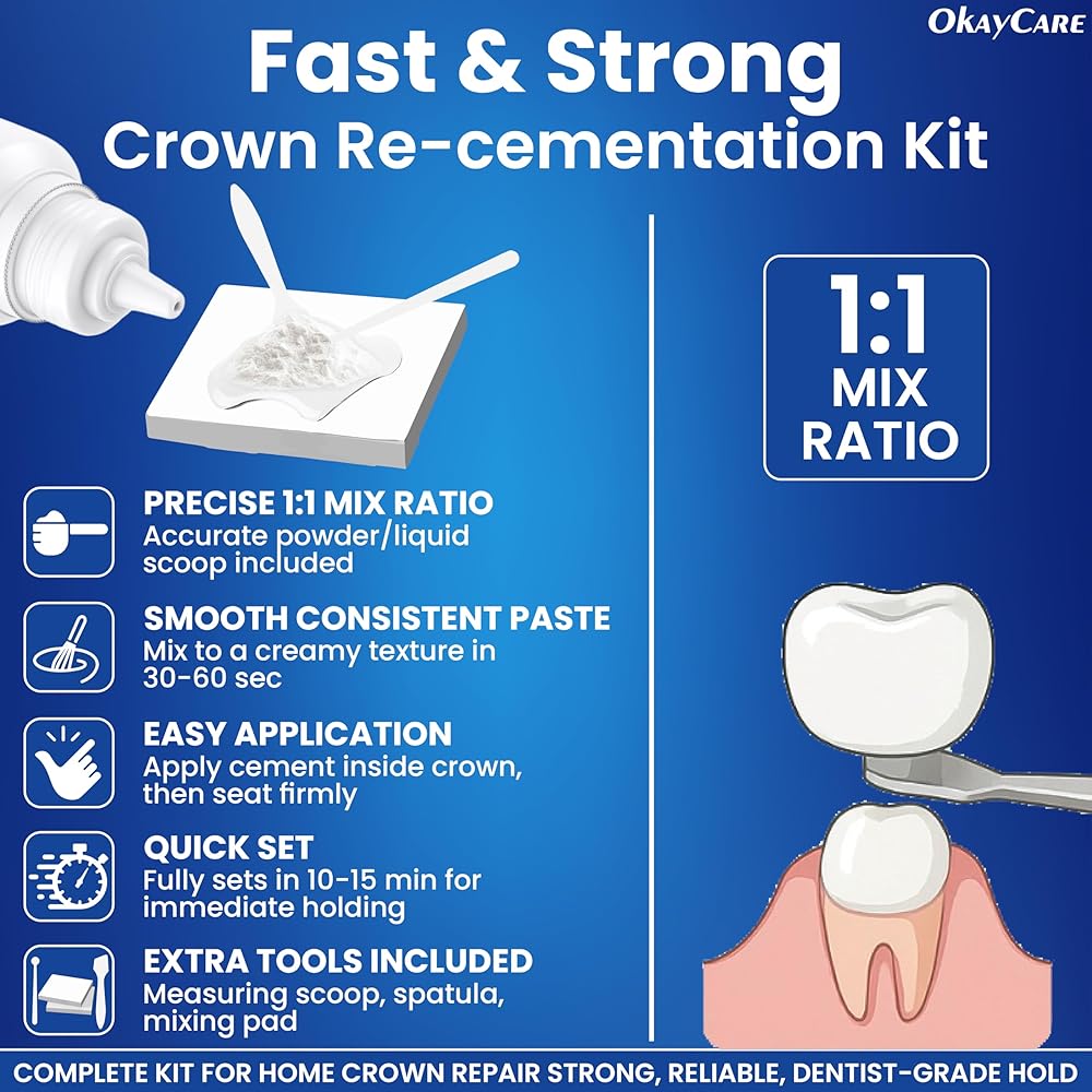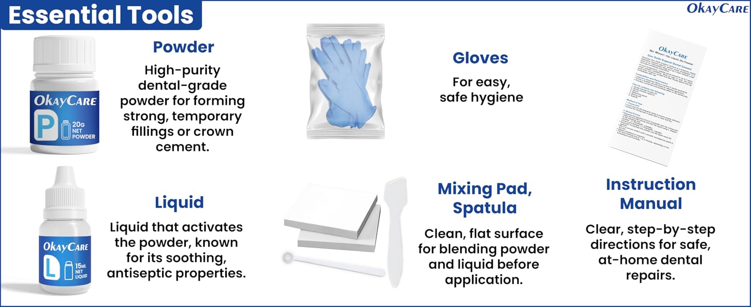 Quick and Easy At-Home Application – The kit is tailored for simple use, allowing both patients and professionals to prepare and apply the mixture in just a few minutes. The powder and liquid blend smoothly to create a workable cement, ideal for emergency repairs or temporary crown placement without the need for specialized dental tools.