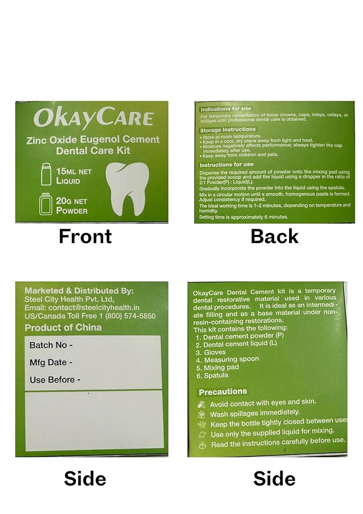 Strong and Reliable Bond – The Zinc Oxide Eugenol Dental Cement is specially formulated to provide a secure and stable temporary hold for crowns, bridges, inlays, and fillings. Its balanced composition ensures firm adhesion while maintaining easy removal when professional treatment is available, giving patients a dependable short-term dental solution.