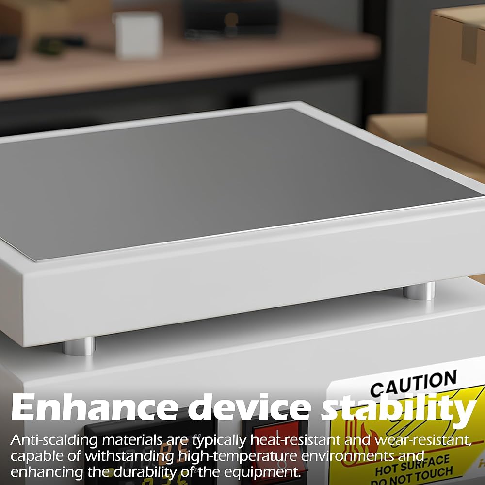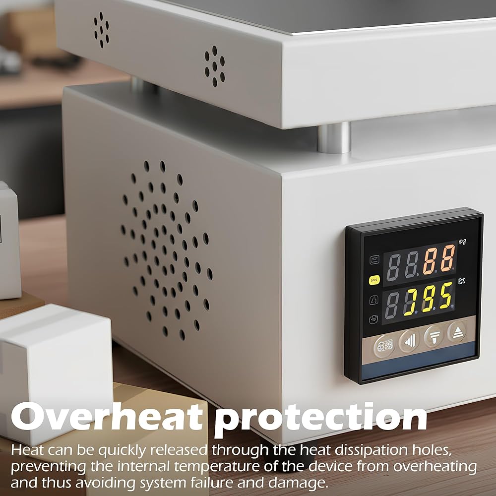 The effective heating plate measures 7.87 x 4.72 inches, made of 6061 aluminum with sandblasting oxidation, 0.6 inches thick. This design ensures uniform and strong heat transfer, and it is also corrosion resistant, guaranteeing a long service life.