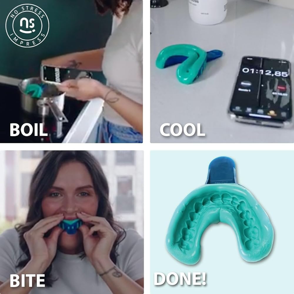 Complete Impression Kit – Includes 2 No Stress Impress boil & bite impression trays, 1 cheek retractor, and step-by-step printed instructions for a full at-home solution.