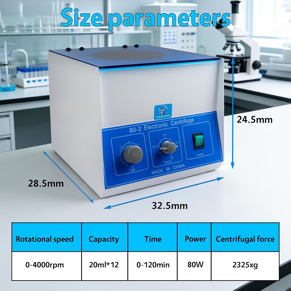 Accurate Performance Parameters: Max Speed: 4000rpm; Capacity: 12×20mL; Max Centrifugal Force: 2325xg. Compatible with 5-10mL vacutainer and 10-15mL centrifuge tubes. Ideal for plasma, serum, PRF, and medical sample separation