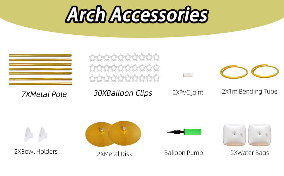 High-Cost Performance Package: 2 bending tube(1m+1m), 2 water-filled bags, 2 metal bases, 30 balloon clips, 7 metal pole and one balloon pump,2 Bowl holders,1 pvc joint. You don't need to purchase any additional components, everything you need is in the kit. You can quickly assemble it without wasting your energy and time.