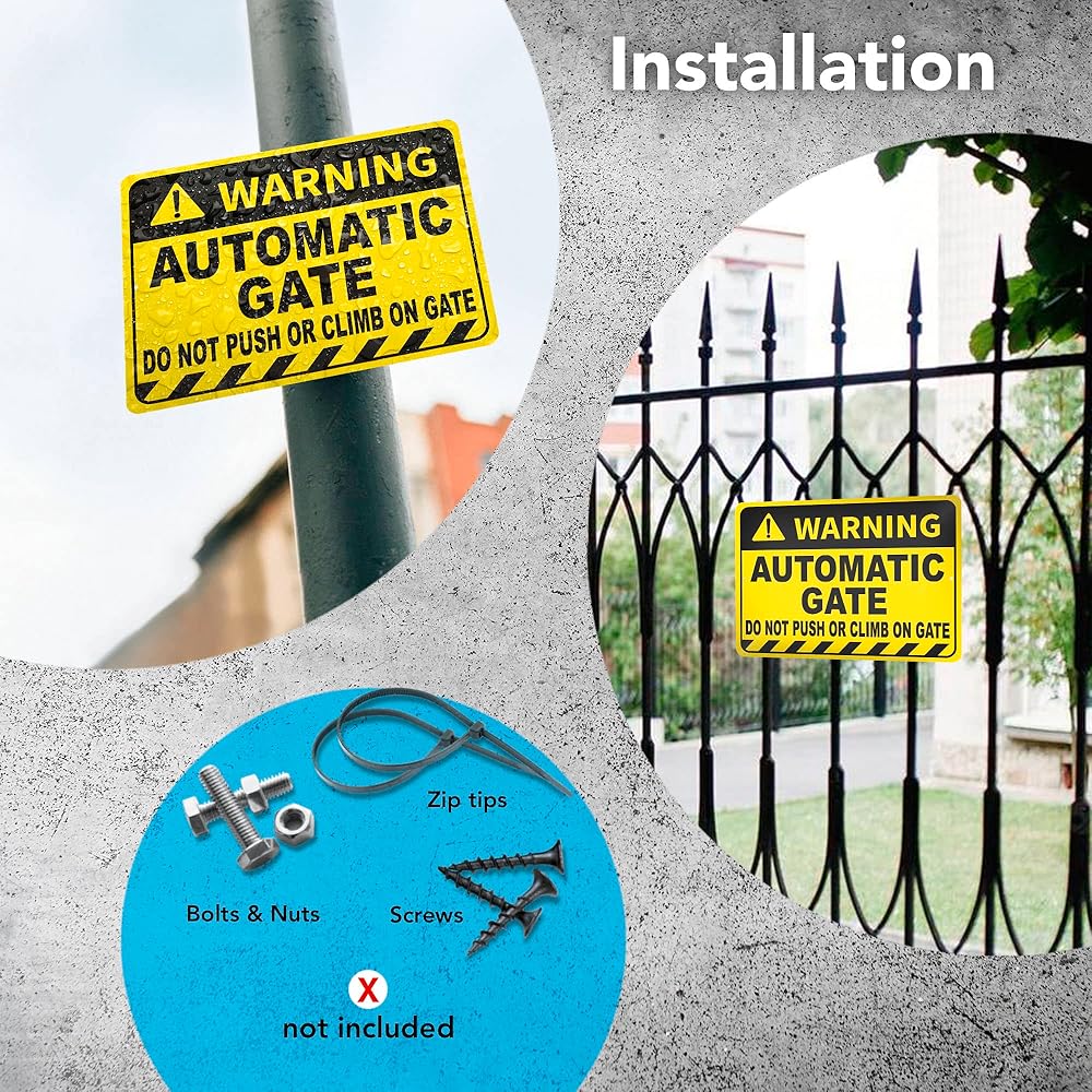Installation : Caution automatic gate sign has pre-drilled holes for quick mounting to a door, fence, wall, gate or pole (screws or zip ties not included).