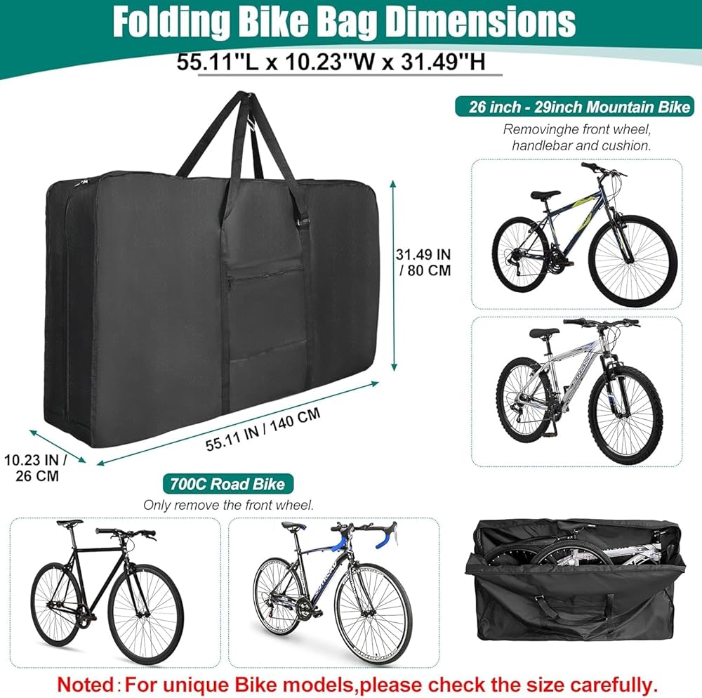 Bike Travel Bag Size: 55.11 × 10.23 × 31.49 inches (140cm x 26cm x 80cm); Fits most bikes: 26-29-inch mountain bikes. Noted: For unique Bike models, please check the size carefully.