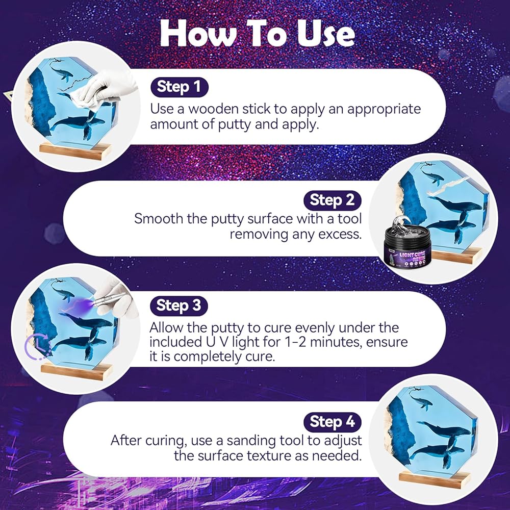Usage Method: Just take out the amount of curing putty you need, add the color to the shape (or fill the gaps), and then use the light for 2-3 minutes until it hardens. Whether it's for repair or making handicrafts, our cure resin can meet your needs.