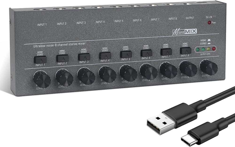 【8-Channel Audio Mixer】The audio mixer collects sound from many different sources into one listening location for monitoring or routing. Each channel on the online mixer has an independent volume control, each channel is equipped with a separate input plug and volume control.