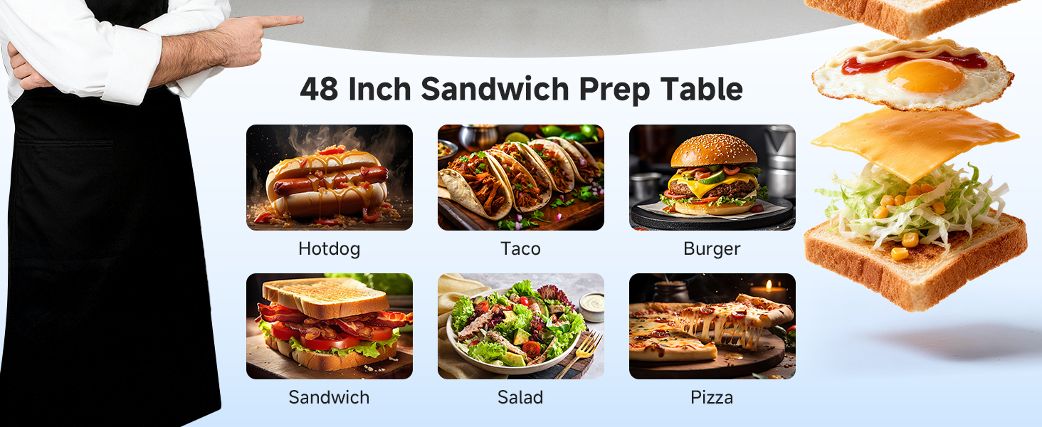 🥪User Friendly & Precision Control🥪The salad prep station features an automatic closing design. The opening angle is less than 90° to close the door automatically, and more than 90° to keep the door open, there is no need for manual pushing or pulling.The removable door seal is easy to clean.This commercial food prep station also has an adjustable shelve, supporting dual-zone storage. It can bear a load of up to 60kg (132.28lbs). You can adjust the height of the shelves to meet your refrigeration needs