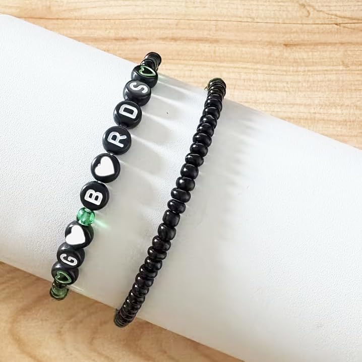- Team Spirit Design: 2-piece set with lettering + green/black beads (heart accents) — shows your football pride instantly