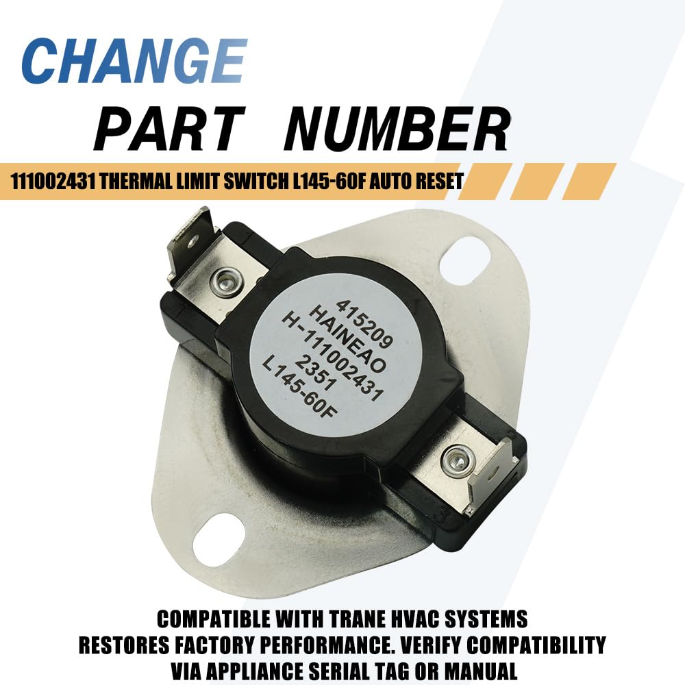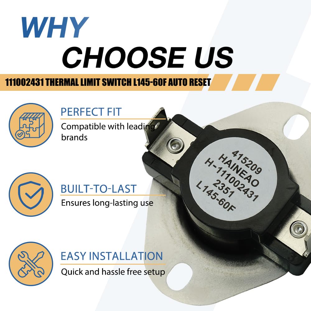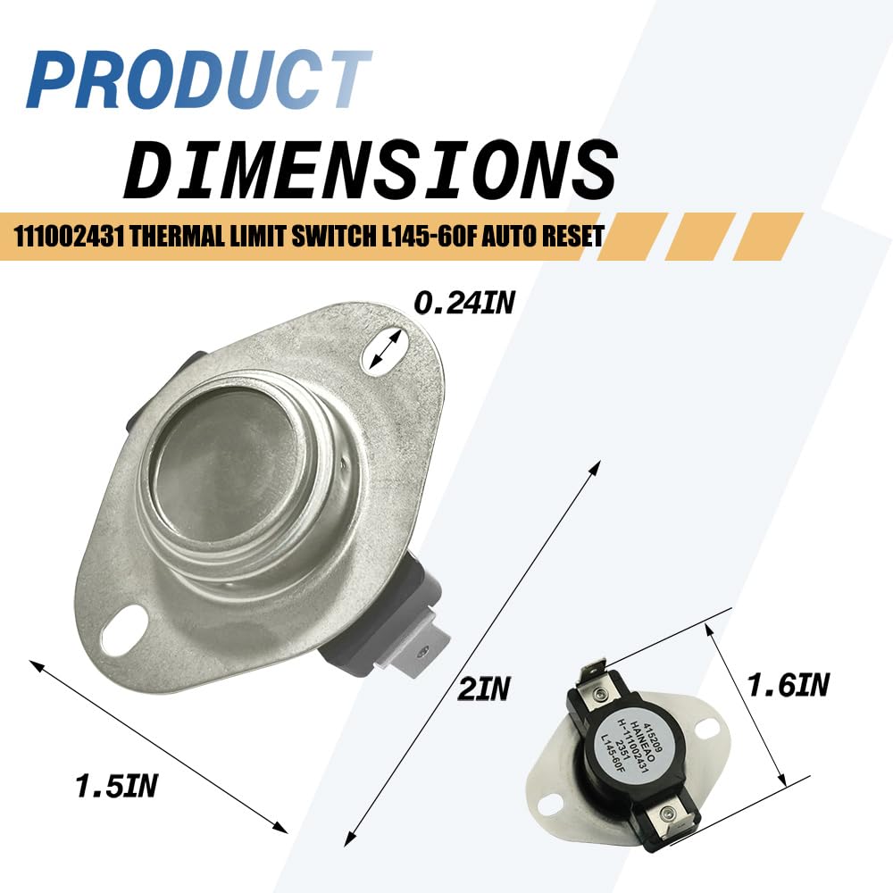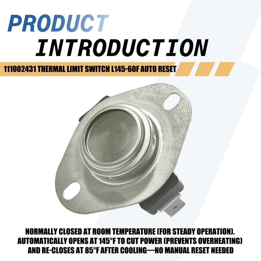 Core Temperature Specifications:This 111002431 is a thermal limit switch with L145-60F rating—automatically cuts off power at 145°F to prevent overheating and resets automatically when cooled to 85°F (145°F - 60°F differential), supporting safe temperature regulation