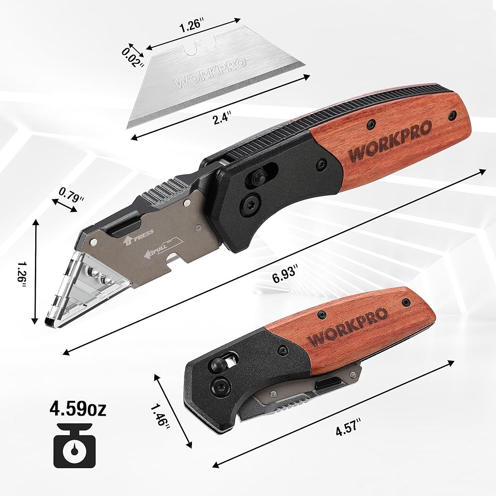 Versatile Usage: The construction knife is suitable for various applications in homes, offices, workshops, and DIY projects. The WORKPRO Folding Utility Knife effortlessly cuts through paper, wallpaper, cartons, cloth, leather, PVC, rope, carpet, drywall, and much more. Additionally, our Box Cutter Knife makes an ideal gift for friends and family