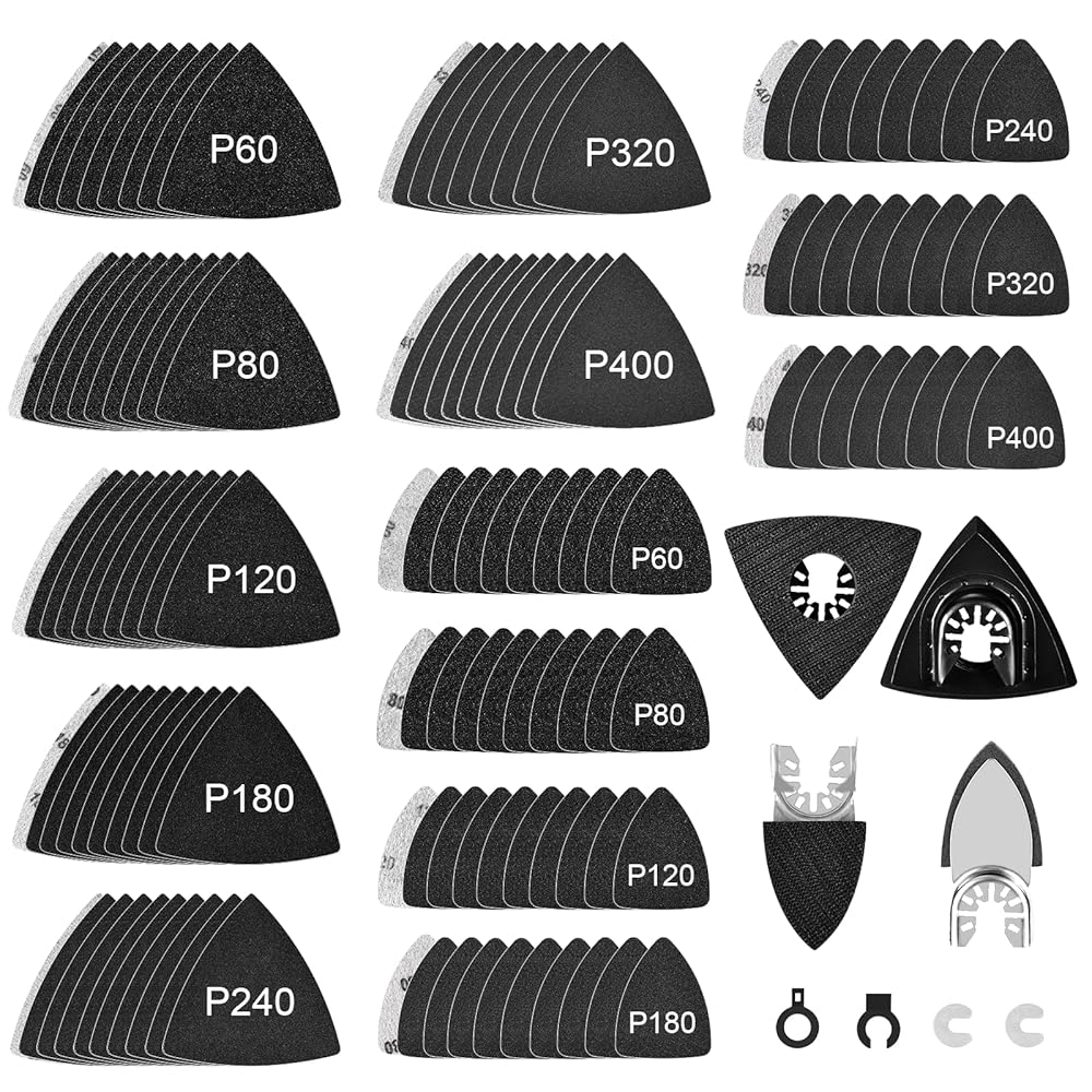 ULTIMATE 148 Pcs Detail Sanding Solution: Oscillating tool sanding attachments pack includes 70 Pcs 80mm triangle sanding pads, 70 pcs finger sanding pads, 2pc 80mm triangle sanding pad holder, 2pc finger sanding pad holder; Assorted 60 80 120 180 240 320 400 grits oscillating tool sandpaper, 10 pcs each; We also provide 4 adapters needed for any detail work