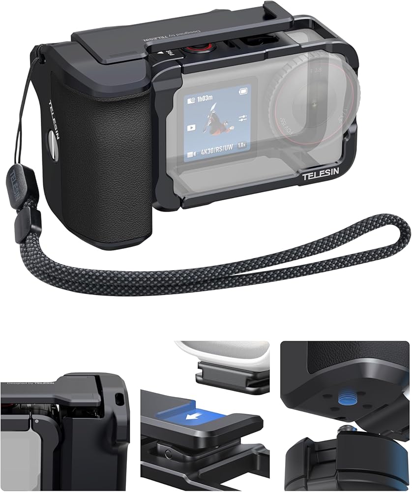 TELESIN Metal Aluminum Alloy Street Grip Kit for DJI Action 6 with Metal Cage Camera Grip Holder with Seesaw Shutter Button Aluminum Alloy Shell Backup TF Card Slot Quick Battery Access