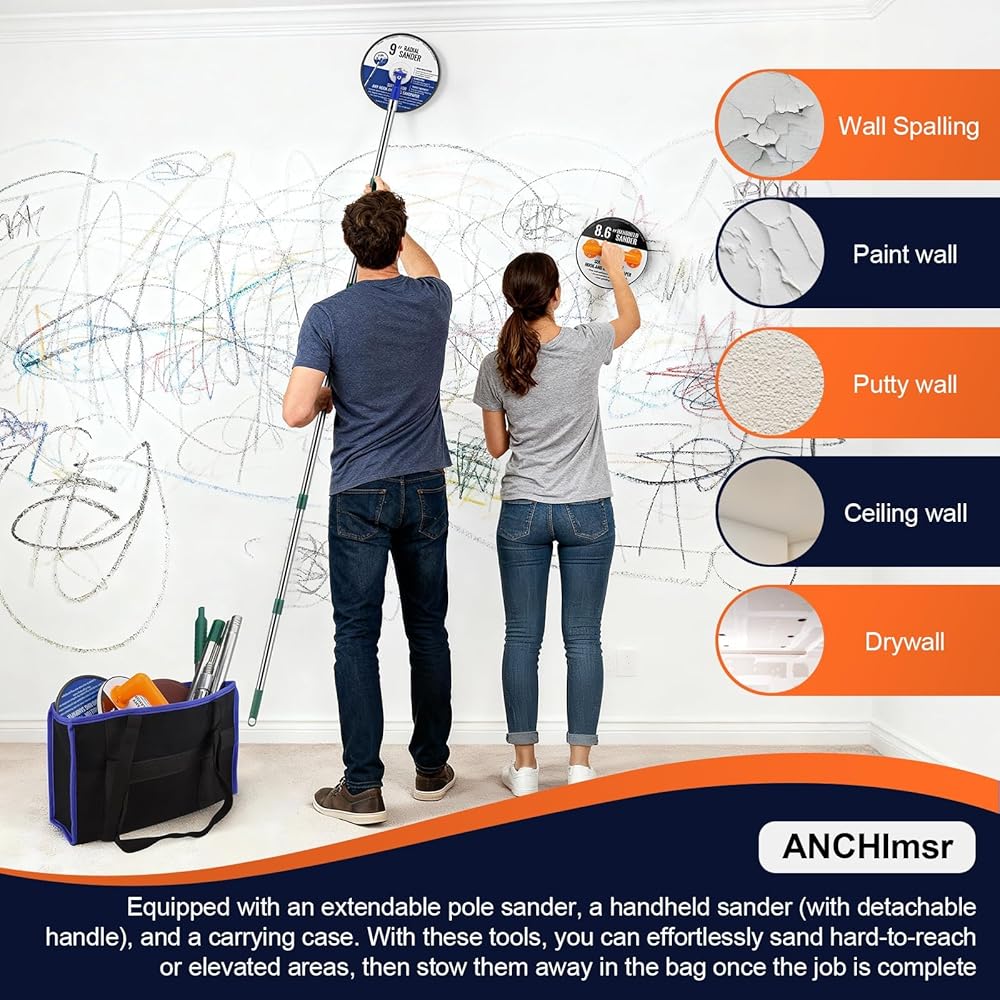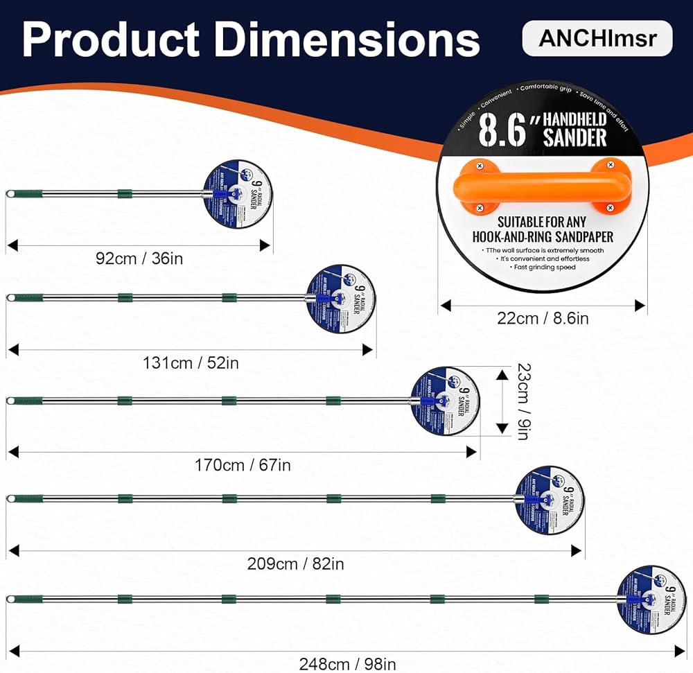 【Drywall Sander with Extension Pole Kit】This drywall sander kit includes a 9" radial pole head that pairs with an adjustable extension pole for fast sanding of large walls and ceilings, plus an 8.6" handheld unit with a detachable handle that installs in seconds using the included screwdriver and screws—perfect for low walls or tight corners where a full - length pole is awkward. Also included: a rugged Oxford carry bag and five hook - and - loop discs (80,-240 grit; lower numbers = coarser cut)