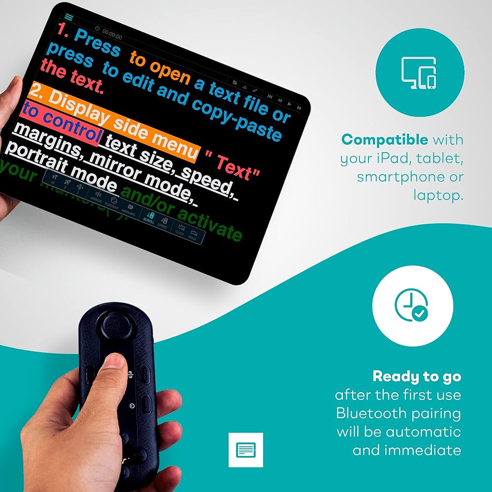 Ready to Use: The included TeleprompterPAD APP lets you control scroll and main app functions, including speed, font size, play-pause, fast backward and forward, and mirror mode. Bluetooth re-pairing is automatic and immediate after the first use.