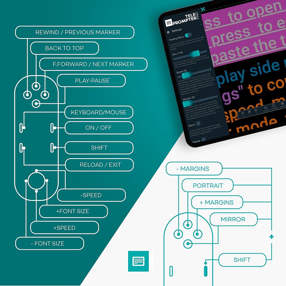 Remote + Teleprompter APP Bundle: Use this remote with any mirror-based teleprompter and download TeleprompterPAD APP, the leading software in professional broadcasting. Designed for our Plug & Play teleprompter remote, it works out of the box without configuration. Enhance your workflow with intuitive script configuration for size, colors, markers, and rich text. Available for iOS, Android, Windows, and Mac.