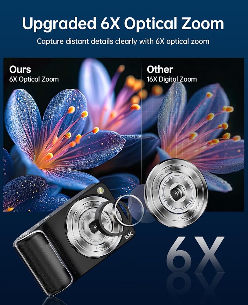 【6X Optical Zoom with Retractable Lens】This compact digital camera features true 6X optical zoom, allowing you to capture clear, detailed images from a distance without quality loss. The retractable lens automatically extends and retracts to protect the lens from dust and scratches, making it more portable and durable. Perfect as a vlogging camera for travel, content creation, outdoor shooting, and everyday photography.