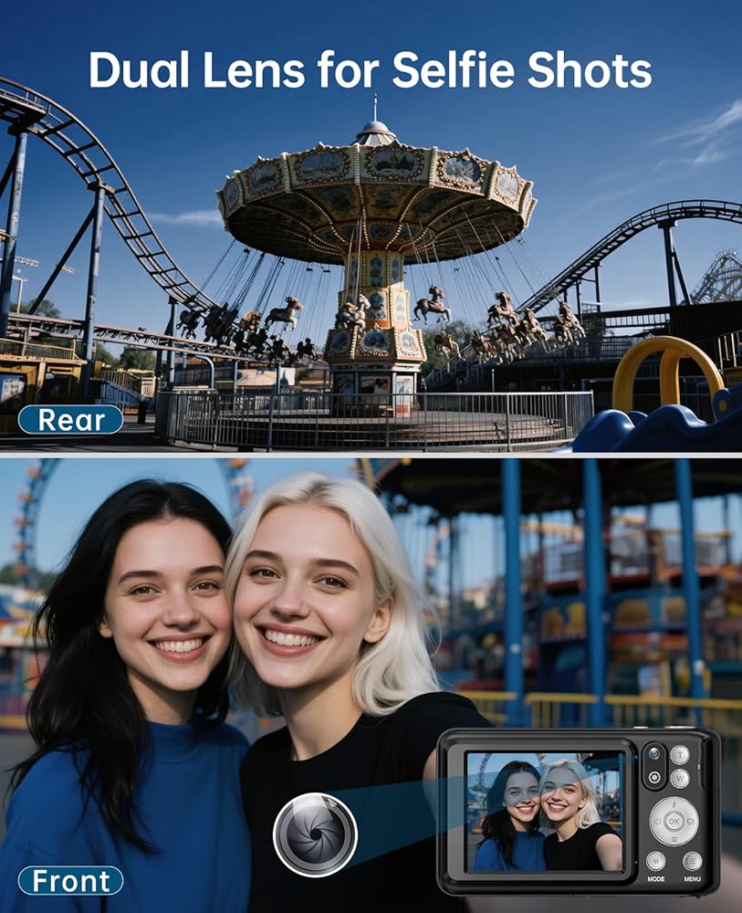 【Pocket-Size Dual Lens Camera with Autofocus】--- This small digital camera with autofocus functionality allows you to effortlessly focus during shooting and capture clear, high-quality images. With one-button switching between front and rear cameras, taking selfies becomes easy. Our travel portable camera is lightweight and compact, perfect for carrying and using on the go. It comes with two rechargeable batteries, ensuring convenience during your travels, so you can capture the beautiful scenery along your journey. This makes it a perfect choice for photography enthusiasts.