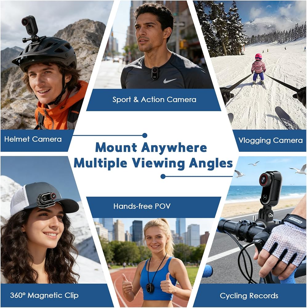 Hands-Free POV Camera & Wearable Design: This vlogging camera adopts a magnetic design and comes with a magnetic clip, allowing for quick attachment to your chest in just one second. (Not suitable for pacemaker users.) Alternatively, you can clip this mini camera onto a hat. The magnetic hat clip supports 360° rotation and angle adjustment, enabling effortless changes in shooting perspective while freeing your hands for first-person video creation.