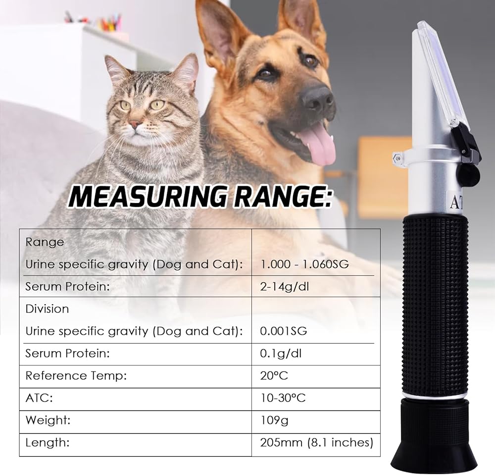 MEASURING RANGE: Dog and Cat Urine specific gravity: 1.000 - 1.060SG ; Serum Protein: 2-14g/dl