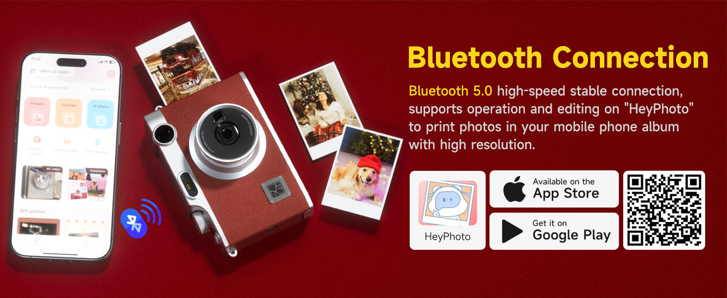 App-Connected Creativity: Bluetooth 5.0 high-speed and stable connection. Download the free "Heyphoto" app to save all photos taken with your Z3 camera. This makes it easy to share them on social media. You can also select photos from your smartphone, crop, rotate, adjust brightness/contrast/saturation, add filters, and then print them directly from your phone using the Heyphoto app and camera