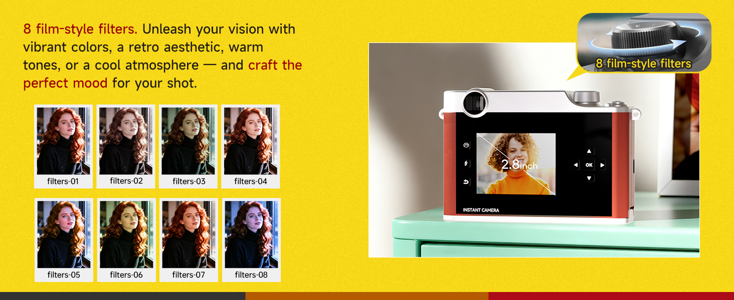 Preview & Save Feature: Equipped with a 2.8in screen, this camara instantanea lets you preview each shot before printing. Check expressions, composition, and lighting with ease. Adjust brightness, apply custom filters, and print only when everything looks perfect—so every sheet of film camera paper captures your best moment