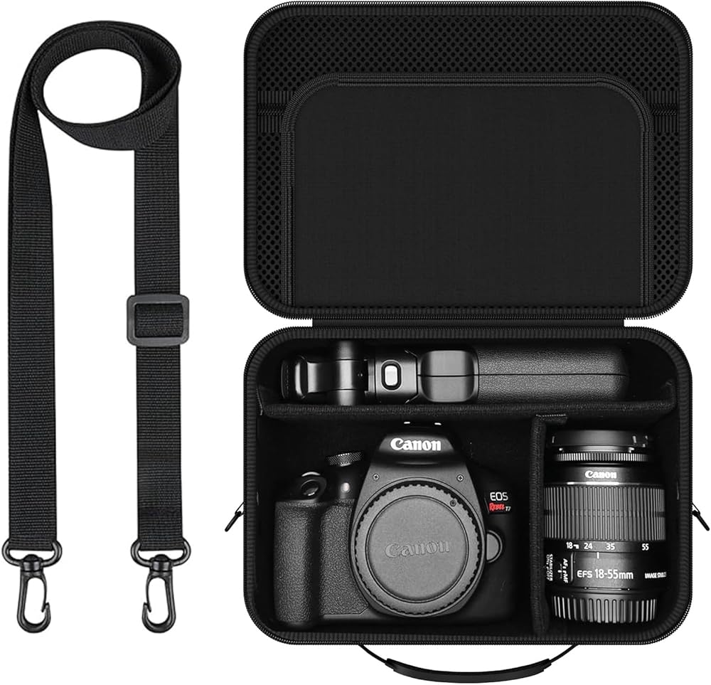 Hard Shell Camera Case Compatible with Canon EOS Rebel T7/R50/R100 and More DSLR & Mirrorless Cameras – Portable Travel Bag with Adjustable Dividers, Mesh Pocket & Shoulder Strap (Black)